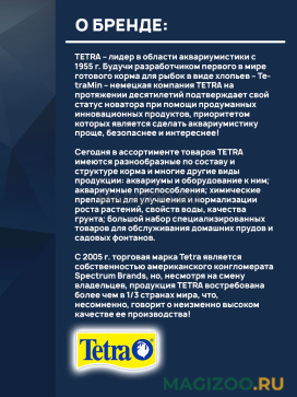 Информация о составе и ингредиентах, цветовом решении, технических и иных характеристиках, стране-изготовителе, внешнем виде и комплекте поставки товара носит справочный характер и основана на последних доступных к моменту публикации сведениях. Доставка данного товара осуществляется во все регионы РФ.Сегодня в ассортименте товаров TETRA имеются разнообразные по составу и структуре корма и многие другие виды продукции: аквариумы и оборудование к ним; аквариумные приспособления; химические препараты для улучшения и нормализации роста растений, свойств воды, качества грунта; большой набор специализированных товаров для обслуживания домашних прудов и садовых фонтанов.