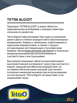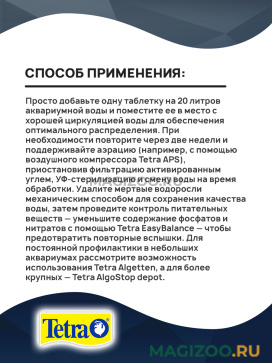 Быстрорастворимые таблетки высвобождают высокоактивный ингредиент сразу при контакте с водой, нарушая метаболизм водорослей, но оставаясь безопасными для рыб, растений и полезных микроорганизмов при использовании по инструкции. Tetra Algizit не замутняет и не окрашивает воду.