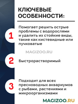- Помогает решить острые проблемы с водорослями и удалить их стойкие виды, такие как кистевидные или пучковатые.