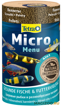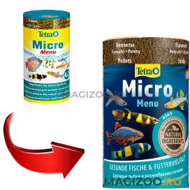 Тетра Микро Меню - это смесь полноценных кормов для всех видов мелких декоративных рыб, которые кормятся в верхних, средних и нижних слоях воды. Диаметр корма варьируется в пределах 0,3–2,5 мм в зависимости от его типа (чипсы, гранулы, пеллеты или палочки), что позволяет с легкостью потреблять корм даже рыбкам с небольшими ртами. Благодаря небольшому размеру экструдаты идеально подходят для мелких рыб: корм быстро размокает в воде, упрощая процесс приема пищи.