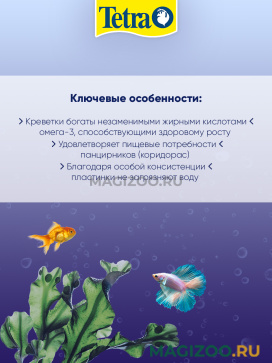 Тетра Кори Шримп Вэйферс — это оптимальное питание с учетом пищевых потребностей коридорасов. В состав корма входят креветки — источник белка и, как следствие, незаменимых аминокислот, которые легко усваиваются, обеспечивая здоровое развитие. Твердая консистенция исключает загрязнение воды. Корм Тетра Кори Шримп Вэйферс разработан специально для оптимального удовлетворения пищевых потребностей коридорасов. Вэйферсы быстро оседают на дне аквариума. Кроме того, их можно размещать в укромных местах, чтобы ничто не нарушало спокойствие пугливых сомиков во время кормления. Форма и состав корма полностью соответствуют естественным пищевым потребностям донных рыб. Тетра Кори Шримп Вэйферс — это разнообразный и сбалансированный корм.