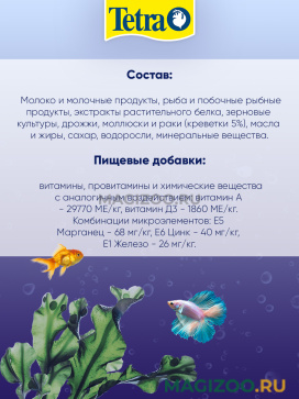 В составе корма содержится полноценный сбалансированный комплекс витаминов, питательных веществ и микроэлементов, необходимых для нормальной жизни рыб.
