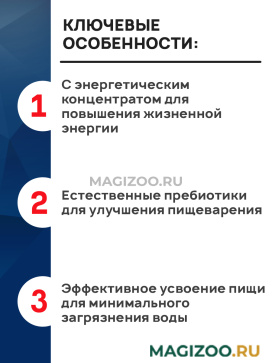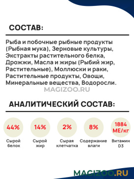 Состав: рыба и побочные рыбные продукты (Рыбная мука), Зерновые культуры, Экстракты растительного белка, Дрожжи, Масла и жиры (Рыбий жир, Растительные), Моллюски и раки, Растительные продукты, Овощи, Минеральные вещества,Водоросли.