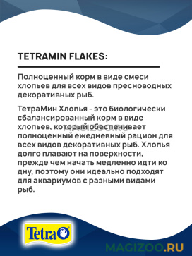 ТетраМин Хлопья - это биологически сбалансированный корм в виде хлопьев, который обеспечивает полноценный ежедневный рацион для всех видов декоративных рыб. Хлопья долго плавают на поверхности, прежде чем начать медленно идти ко дну, поэтому они идеально подходят для аквариумов с разными видами рыб.