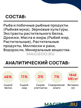 Состав: рыба и побочные рыбные продукты (Рыбная мука), Зерновые культуры, Экстракты растительного белка, Дрожжи, Масла и жиры (Рыбий жир, Растительные), Растительные продукты, Моллюски и раки, Водоросли, Минеральные вещества.