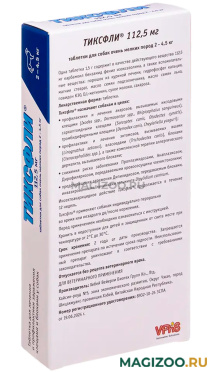 Тиксфли® 112,5 мг (таблеткидля собак очень мелких пород (2-4,5 кг)). Каждая таблеткамассой 1,5 г содержит в качестве действующего вещества 112,5 мг карбамоил бензамид фенил изоксазолина, а также вспомогательные вещества.