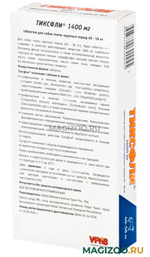 Тиксфли® 1400 мг (таблетки для собак очень крупных пород (>40-56 кг)). Каждая таблетка массой 4,0 г содержит в качестве действующего вещества 1400 мг карбамоил бензамид фенил изоксазолина, а также вспомогательные вещества.