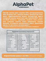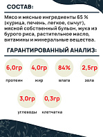 Мясо и мясные субпродукты (телятина 60 %, печень говяжья 25 %, курица 7 %), растительные масла, мускатный орех, минеральные вещества, смесь токоферолов и экстракт розмарина.