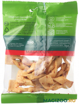 Высушенные кусочки говяжьей кожи неправильной формы в обсыпке из молотых говяжьих кишок.