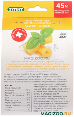 Состав: мука из цельной пшеницы 66%, говядина 8%, масло растительное 6%, сыр 5%, мука рисовая 5%, мука кукурузная 4%, кишки говяжьи 3%, шпинат 2%, патока 1%.