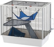 Большая, подходит для нескольких крыс, большая фронтальная дверца и откидной верх позволяют удобно крепить гамачки и полки.