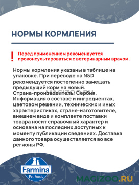 Рекомендации по кормлению: Нормы кормления указаны в таблице на упаковке. При переводе на N&D рекомендуется постепенно замещать предыдущий корм на новый.
