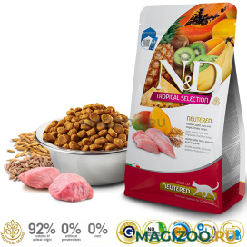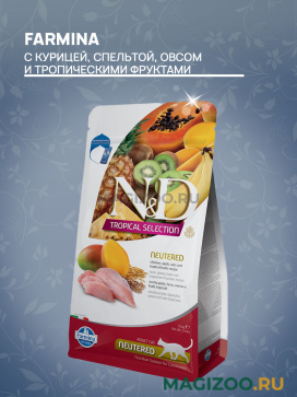 FARMINA N&D TROPICAL SELECTION - это новая линия кормов, разработанная Farmina, изготовленная из зерновых с низким гликемическим индексом (полбой и овсом) и различных тропических фруктов для хорошего самочувствия кошек и собак.