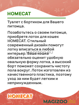 Позаботьтесь о своем питомце, приобретя лоток для кошек HOMECAT. Стильный современный дизайн помогут лотку вписаться в любой интерьер. Ваша кошка обязательно оценит удобную овальную форму лотка, а высокий борт поможет сохранить чистоту пола вокруг. Лоток изготовлен из качественного пластика, поэтому уход за ним будет легким и непринужденным.