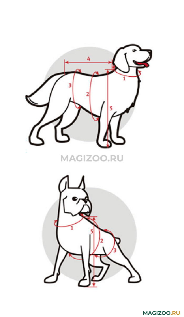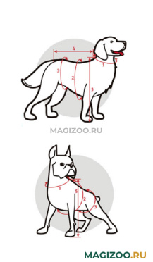 • Мерки с собаки необходимо снимать четко, как показано на рисунке, не затягивая и не прибавляя. От этого будет зависеть удобство подобранной одежды для Вашего питомца.