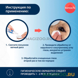 Применяют собакам, кошкам, котятам, щенкам, кроликам и хорькам для гигиенической обработки глаз, для удаления выделений и засохших корочек при хронических конъюнктивитах, повышенном слезотечении, различных инфекциях, при повреждениях конъюнктивы, а также устранения покраснений и отечности век.