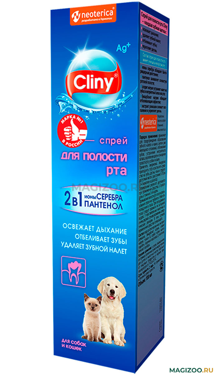 Спрей для полости рта CLINY применяют для предупреждения образования зубного налета и зубного камня, снятия уже имеющихся отложений, отбеливания зубов, устранения неприятного запаха, укрепления десен и очищения полости рта у собак и кошек.