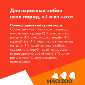 Цельные злаки (маис, пшеница), мука из мяса курицы 12%, мука из мяса говядины 4%, мука из мяса индейки 4%, куриный жир 4%, гидролизованная печень говядины 4%, сушеная мякоть свеклы, семена льна, отруби, сушеная морковь, пивные дрожжи, рыбий жир 0,3%, минералы, витамины, аминокислоты, антиоксидант.