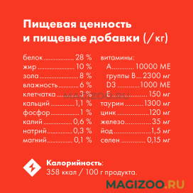 Информация о составе и ингредиентах, цветовом решении, технических и иных характеристиках, стране-изготовителе, внешнем виде и комплекте поставки товара носит справочный характер и основана на последних доступных к моменту публикации сведениях. Доставка данного товара осуществляется во все регионы РФ.Завод по производству корма располагается в пригороде Санкт-Петербурга.