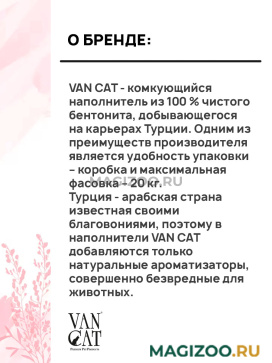 VAN CAT - комкующийся наполнитель из 100 % чистого бентонита, добывающегося на карьерах Турции. Одним из преимуществ производителя является удобность упаковки – коробка и максимальная фасовка – 20 кг.