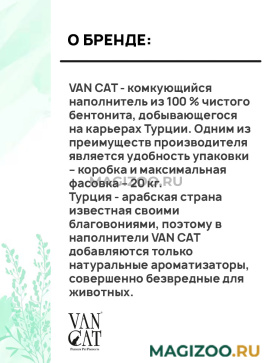 VAN CAT - комкующийся наполнитель из 100 % чистого бентонита, добывающегося на карьерах Турции. Одним из преимуществ производителя является удобность упаковки – коробка и максимальная фасовка – 20 кг.