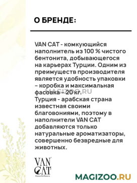 VAN CAT - комкующийся наполнитель из 100 % чистого бентонита, добывающегося на карьерах Турции. Одним из преимуществ производителя является удобность упаковки – коробка и максимальная фасовка – 20 кг.