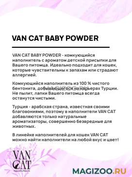 VAN CAT BABY POWDER - комкующийся наполнитель с ароматом детской присыпки для Вашего питомца. Идеально подходит для кошек, которые чувствительны к запахам или страдают аллергией.