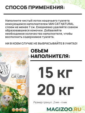 Наполните чистый лоток кошачьего туалета комкующимся наполнителем VAN CAT NATURAL слоем не менее 7 см. Ежедневно удаляйте совком образовавшиеся комочки. Добавляйте необходимое количество наполнителя, чтобы восполнить содержимое туалета.