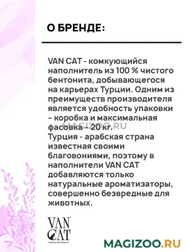 Информация о составе и ингредиентах, цветовом решении, технических и иных характеристиках, стране-изготовителе, внешнем виде и комплекте поставки товара носит справочный характер и основана на последних доступных к моменту публикации сведениях. Доставка данного товара осуществляется во все регионы РФ.Турция - арабская страна известная своими благовониями, поэтому в наполнители VAN CAT добавляются только натуральные ароматизаторы, совершенно безвредные для животных. Также в линейке наполнителей для кошек VAN CAT можно найти наполнители на любой вкус и цвет: с цветными гранулами, с ароматом детской присыпки, лаванды или хвойного леса. Крупные кошки тоже не оставлены без внимания производителем, ведь в линейке присутствуют наполнители с более крупными гранулами размером до 4 мм.