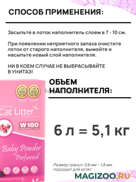 VAN CAT BABY POWDER – это комкующийся наполнитель с мелкими гранулами, близкими по размеру к толщине морского песка (0,6 мм -1,8 мм).
