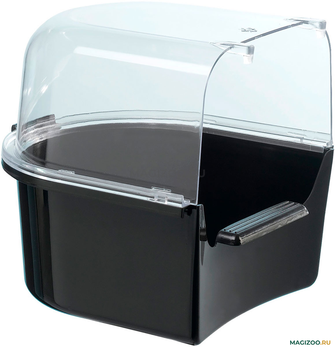 В ванночке Trevi от компании Ferplast имеется широкая основа с бортиками для наполнения водой, прозрачный верх для защиты от разбрызгивания и удобная жердочка.