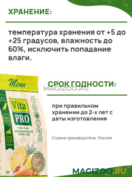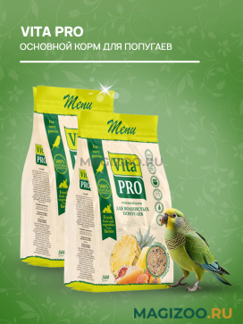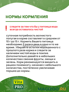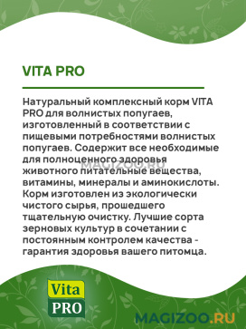 Натуральный комплексный корм VITA PRO для волнистых попугаев, изготовленный в соответствии с пищевыми потребностями волнистых попугаев.