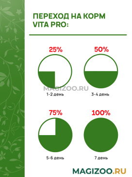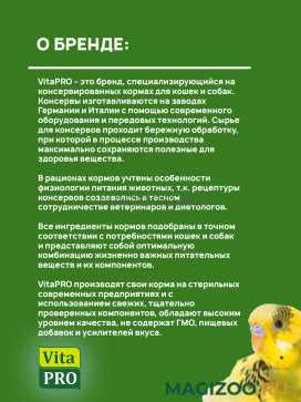 VitaPRO производят свои корма на стерильных современных предприятиях и с использованием свежих, тщательно проверенных компонентов, обладают высоким уровнем качества, не содержат ГМО, пищевых добавок и усилителей вкуса.