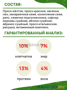 Состав: Просо жёлтое, просо красное, овсянка, лен, канареечное семя, конопляное семя, рапс, семечки подсолнечника, сафлор, морковь сушёная, яблоко сушёное, абрикос сушёный, просо итальянское, ракушка, витаминный комплекс.