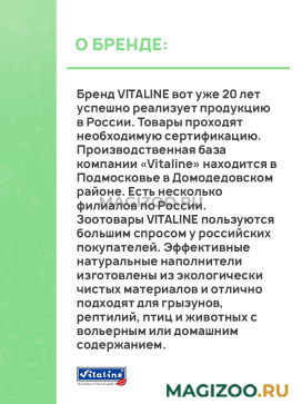 Зоотовары VITALINE пользуются большим спросом у российских покупателей. Эффективные натуральные наполнители изготовлены из экологически чистых материалов и отлично подходят для грызунов, рептилий, птиц и животных с вольерным или домашним содержанием.