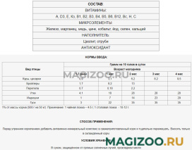 Витамины: А, D3, Е, Кз, В1, В2, В3, В4, В5, В6, В12, Вс, Н, С.
