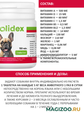 Витаминно-минеральный комплекс предназначен для восстановления организма собаки после различных заболеваний, повышает сопротивляемость организма и укрепляет его общее физическое состояние, нормализует обмен веществ, хорошо усваивается даже при нарушении усвоения питательных веществ, рекомендуется применять во время выздоровления после перенесенных болезней, при повышенных нагрузках, в неблагоприятных экологических условиях.