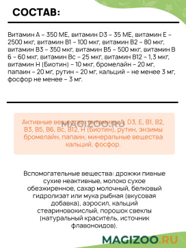 Витамин А – 350 МЕ, витамин D3 – 35 МЕ, витамин Е – 2500 мкг, витамин В1 – 100 мкг, витамин В2 – 80 мкг, витамин В3 – 350 мкг, витамин В5 – 500 мкг, витамин В6 – 60 мкг, витамин Вс – 25 мкг, витамин В12 – 1,3 мкг, витамин Н (Биотин) – 10 мкг, бромелайн – 20 мг, папаин – 20 мг, рутин – 20 мг, кальций – не менее 3 мг, фосфор не менее – 3 мг.
