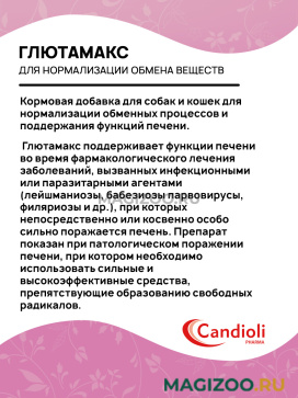 Глютамакс поддерживает функции печени во время фармакологического лечения заболеваний, вызванных инфекционными или паразитарными агентами (лейшманиозы, бабезиозы парвовирусы, филяриозы и др.), при которых непосредственно или косвенно особо сильно поражается печень. Препарат показан при патологическом поражении печени, при котором необходимо использовать сильные и высокоэффективные средства, препятствующие образованию свободных радикалов.