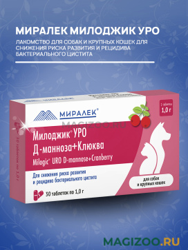 Функциональное лакомство «Милоджик Уро Д-манноза+клюква» помогает предотвратить развитие бактериального цистита и улучшить состояние мочевого пузыря.