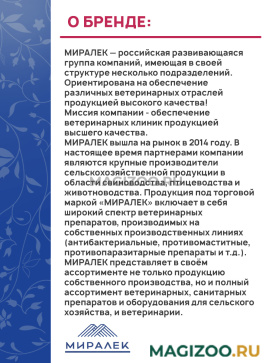 МИРАЛЕК представляет в своём ассортименте не только продукцию собственного производства, но и полный ассортимент ветеринарных, санитарных препаратов и оборудования для сельского хозяйства, и ветеринарии.
