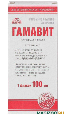 Гамавит применяют для повышения естественной резистентности, иммунокоррекции и снижения последствий интоксикаций у собак, кошек, сельхозживотных, пушных зверей и птиц.