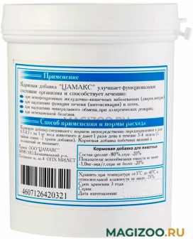 ЦАМАКС для собак крупных пород способствует восстановлению шерсти, утраченной в результате нарушения минерального обмена и длительных болезней кожи. Является сильным профилактическим средством против мочекаменных болезней, восстанавливает функции печени и почек и снимает аллергические реакции.