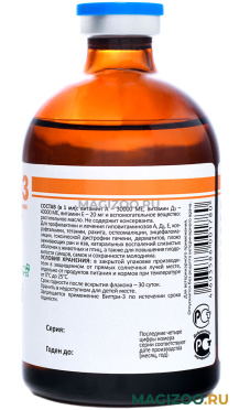 Виттри-3 раствор для инъекций содержит в (1 мл) витамин А – 30 000 МЕ, витамин D3 – 40 000 МЕ, витамин Е – 20 мг, и также вспомогательное вещество – растительное масло.