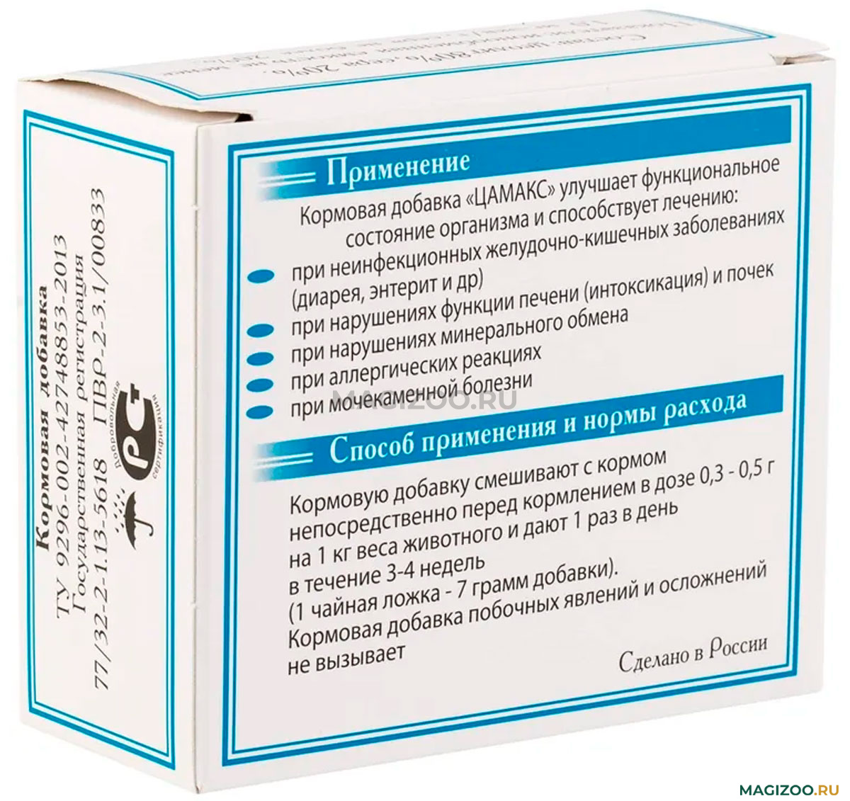 Применение ЦАМАКСа для домашних животных не исключает использование других кормовых добавок, лекарственных средств и витаминов.