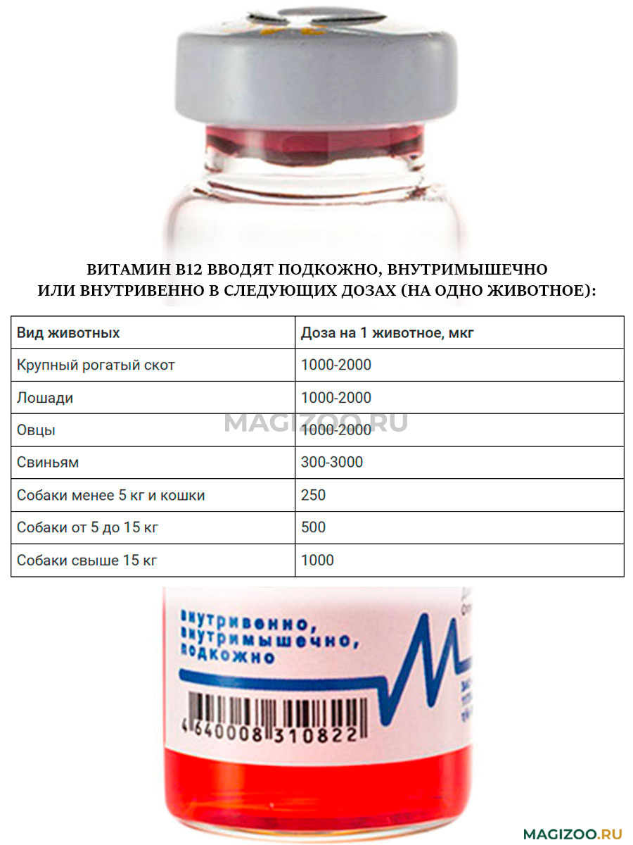Витамин В12 вводят подкожно, внутримышечно или внутривенно в следующих дозах (на одно животное):