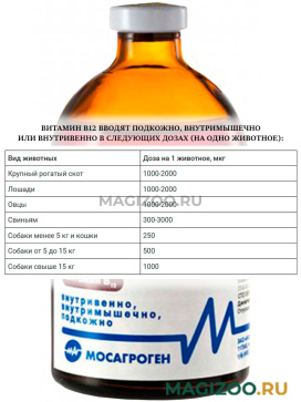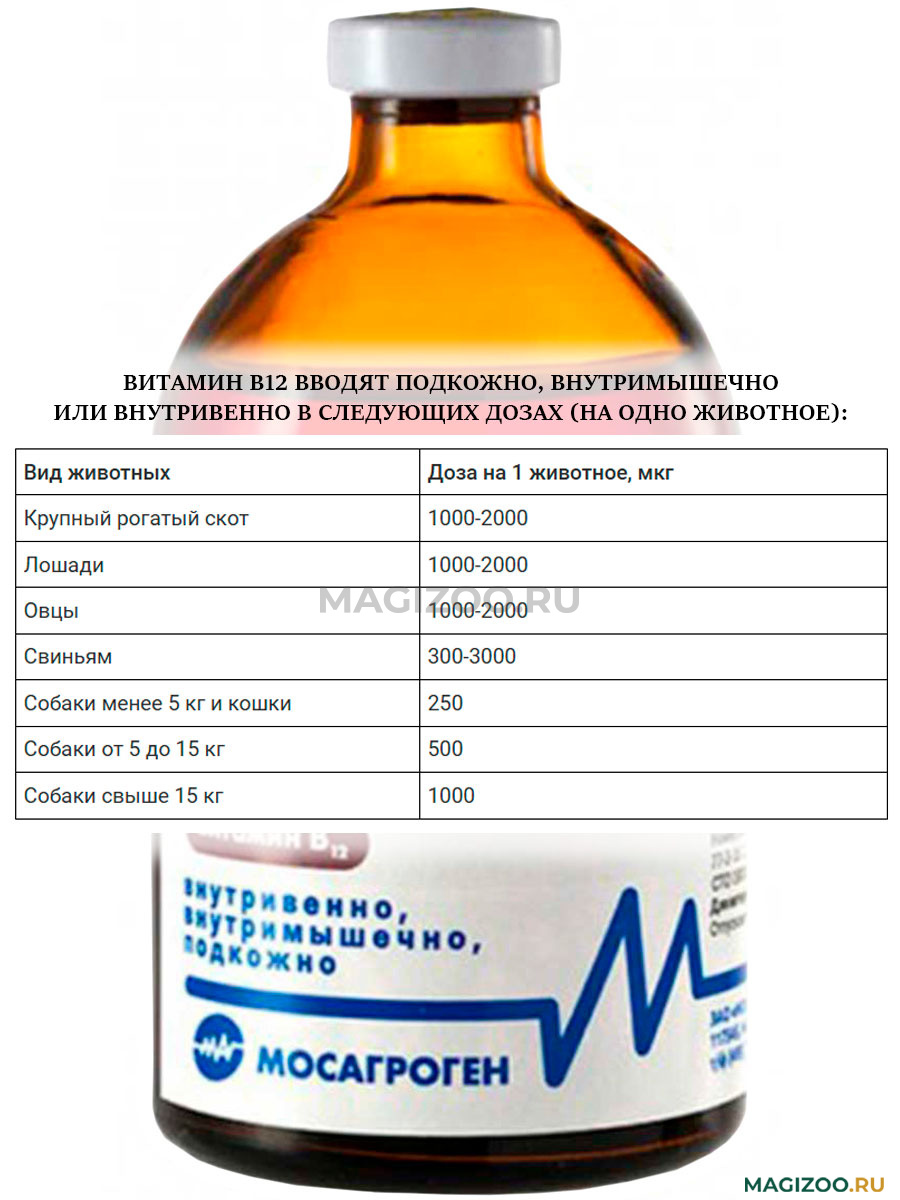 Витамин В12 вводят подкожно, внутримышечно или внутривенно в следующих дозах (на одно животное):