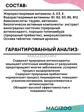 Витаминно-минеральный комплекс для предупреждения заболеваний мочевыводящих путей, обеспечения физиологических потребностей кастрированных котов и кошек в витаминах и аминокислотах, обогащения рациона природными антиоксидантами и пребиотиками.