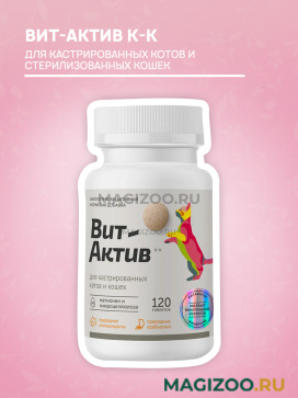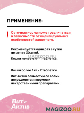 Вит-Актив - витаминно-минеральный комплекс нового поколения с природными антиоксидантами и пребиотиками. Обеспечивает физиологическую потребность взрослых кошек в витаминах и аминокислотах. Способствует поддержанию pH мочи на физиологическом уровне. Снижает риск возникновения заболеваний мочевыводящей системы. Ускоряет процесс выздоровления. Повышает усвоение витаминов, микроэлементов и антиоксидантов.