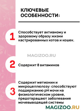 - Содержит метионин и микроцеллюлозу: способствуют поддержанию pH мочи на физиологическом уровне, предотвращают заболевания мочевыводящей системы.